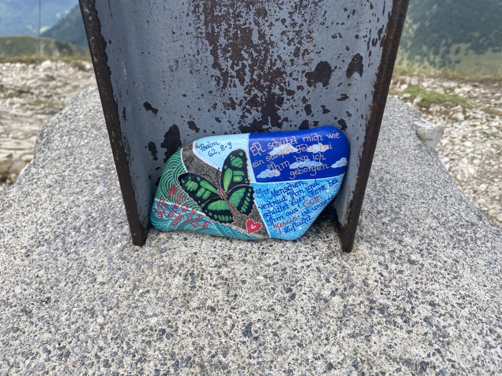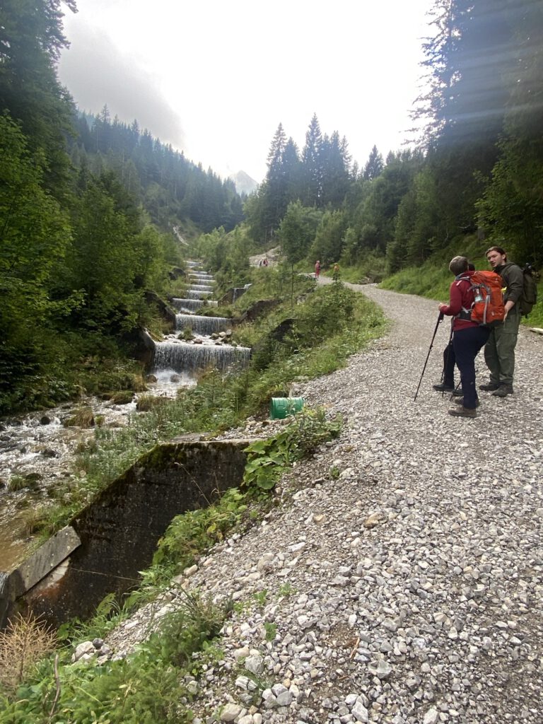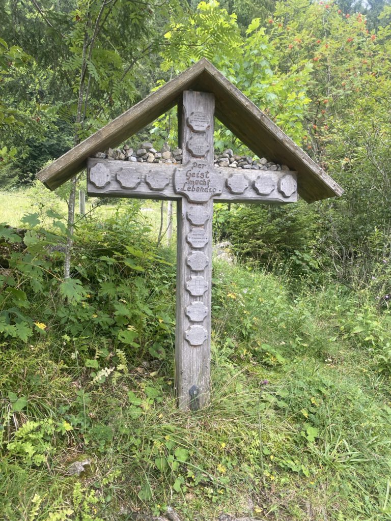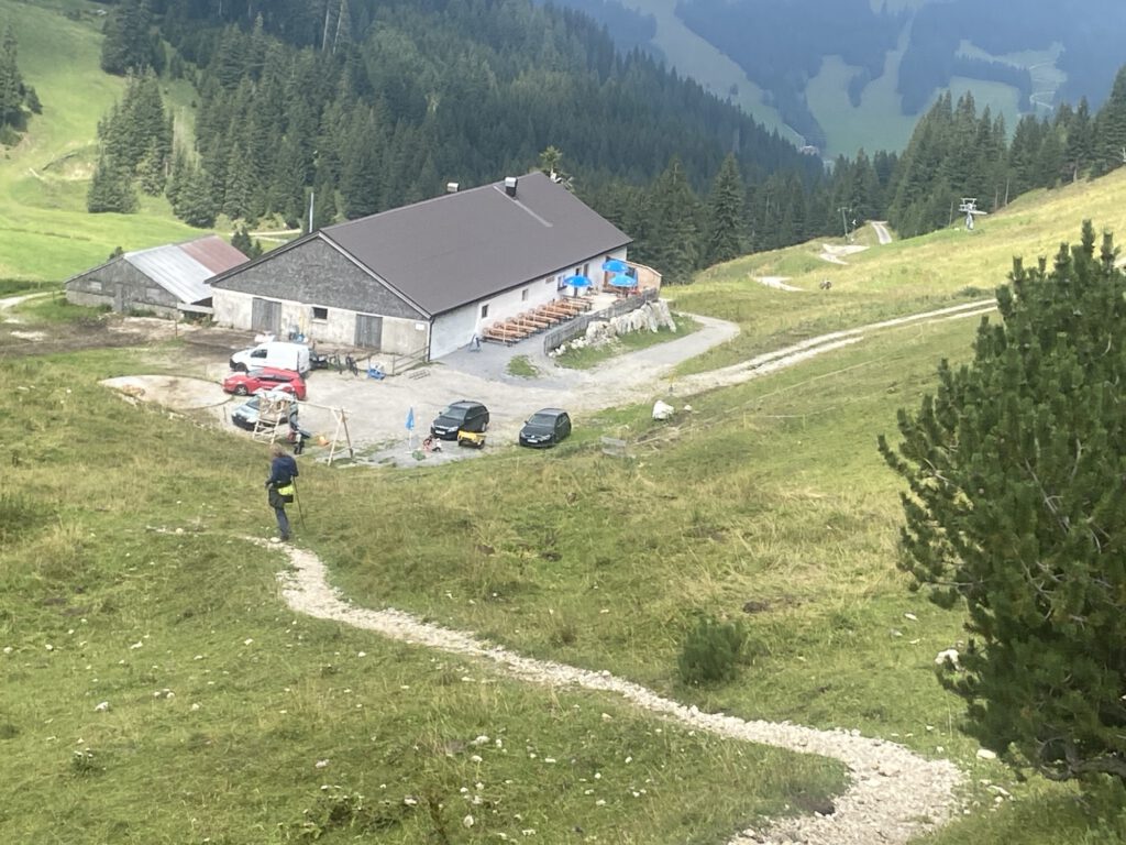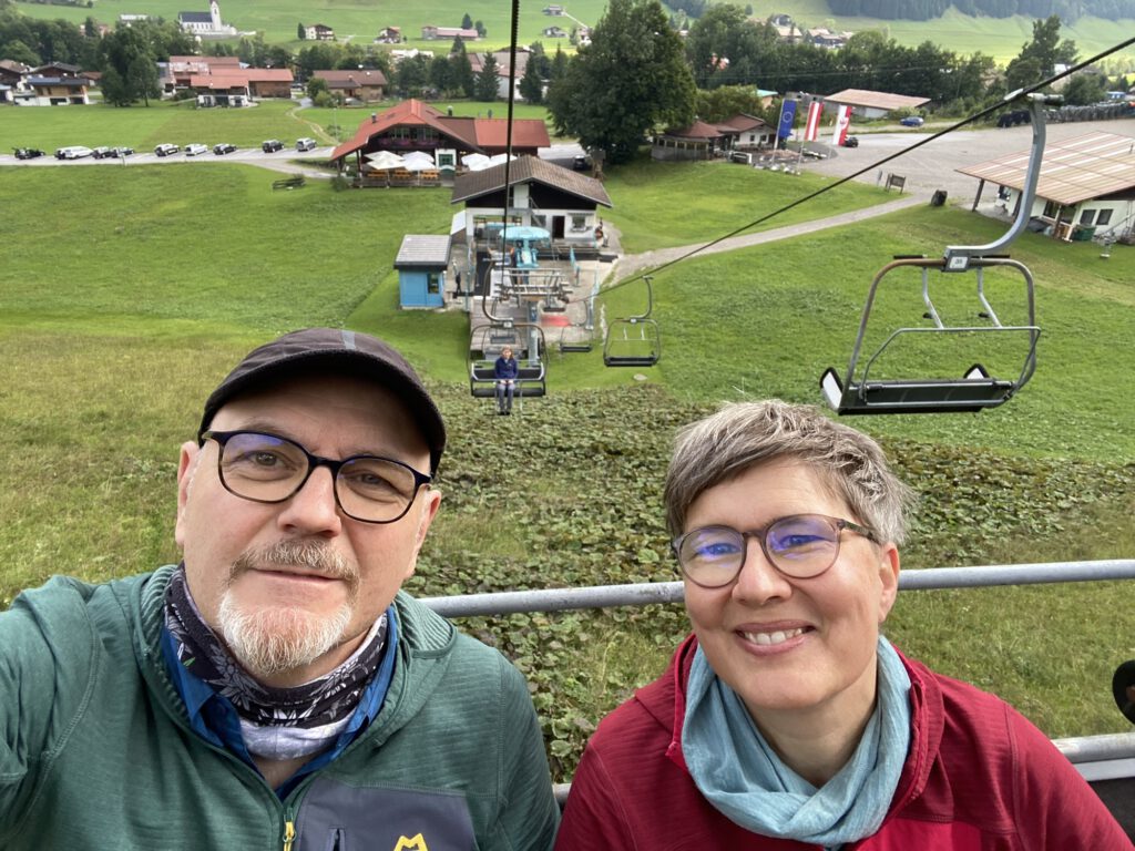 Wir entschließen uns zum ersten Mal mit der Wannenjoch-Bahn zu fahren, einem Sessellift in Schattwald und von da auf den B’schießer zu gehen. Vom Kreuz dann, anders als von Komoot vorgeschlagen, nicht weiter zum nächsten Gipfel, sondern durch das Stuibental abwärts zu wandern, und in der Stuiben Sennalpe einzukehren.