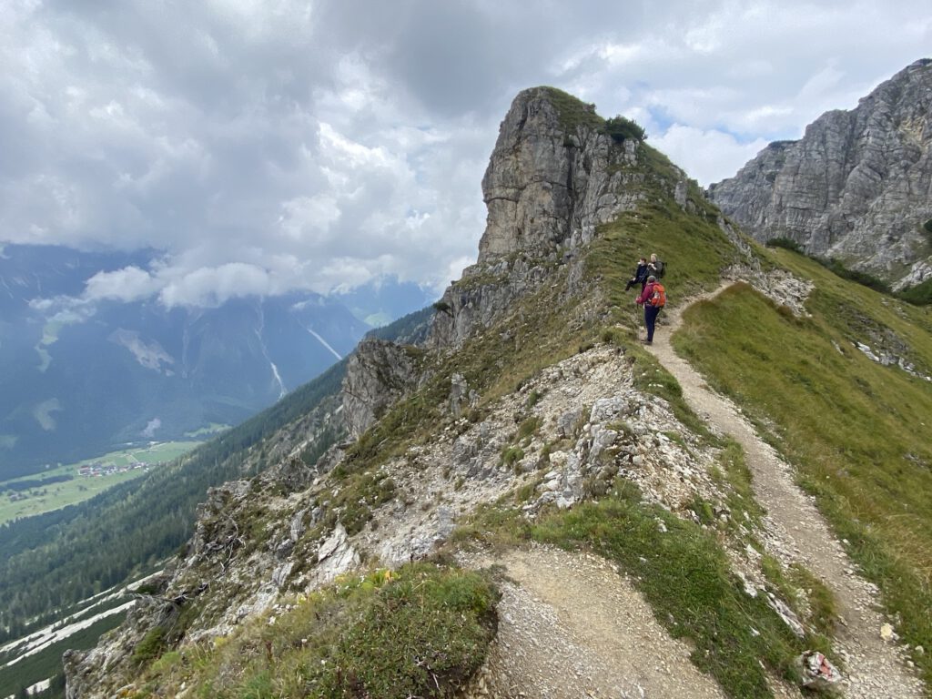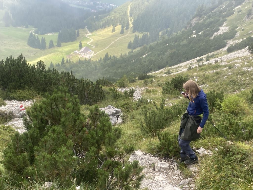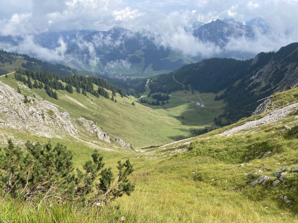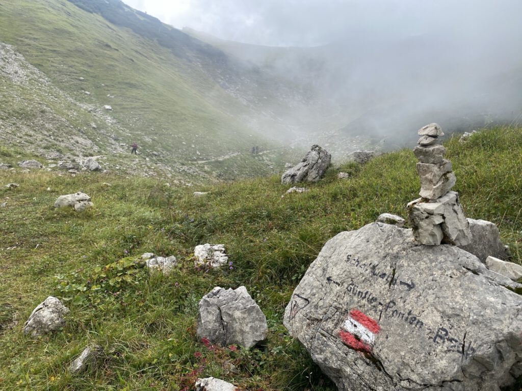 Der Abstieg ins Stuibental beginnt mit einer Kammwanderung bis zum Sattel. Hier teilt es sich, Abstieg ins Tal oder Wiederaufstieg zum nächsten Gipfel, dem Ponten. Das ist uns für heute zu viel und wir nehmen den Abstieg in Angriff. Dieser ist geröllig, immer mal wieder recht steil aber doch gut machbar. Mittlerweile zieheh Nebelschwaden vom Tal nach oben und lassen die Stuibenalpe, die man eigentlich von überall her sehen kann, aus dem Blick verschwinden.