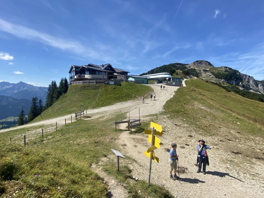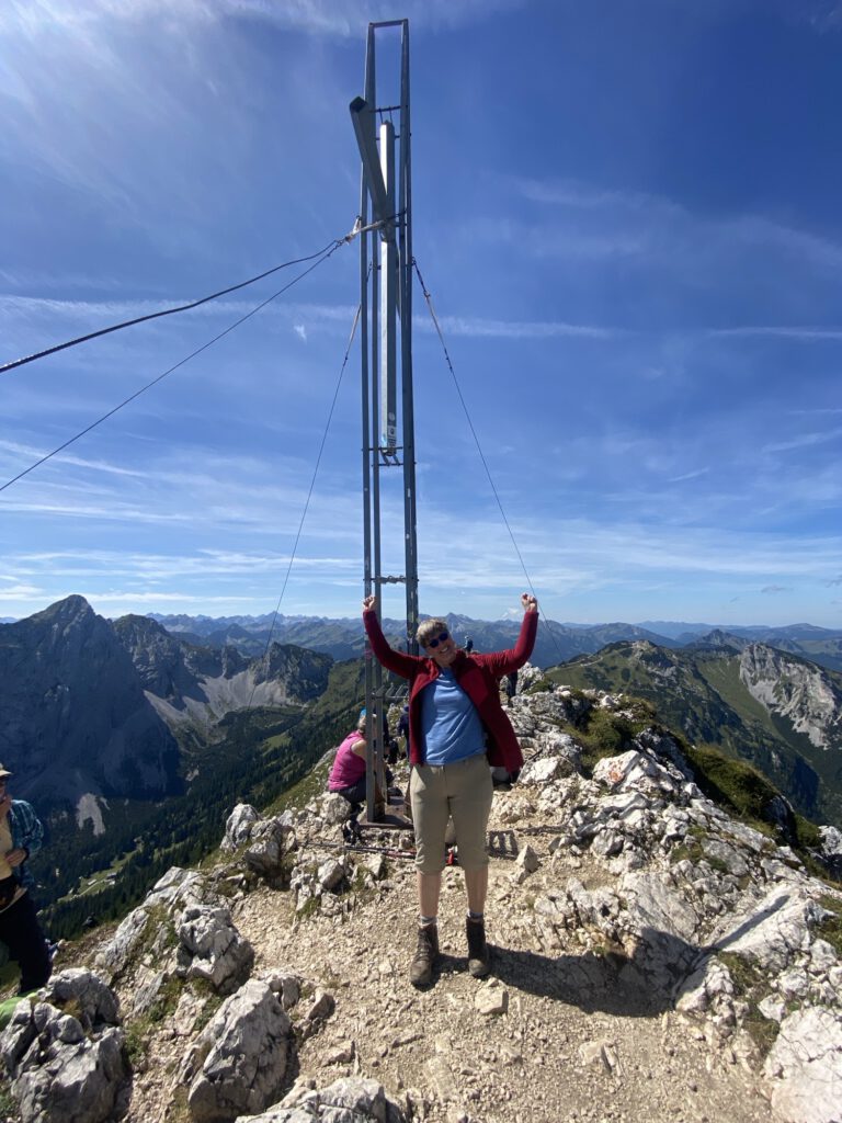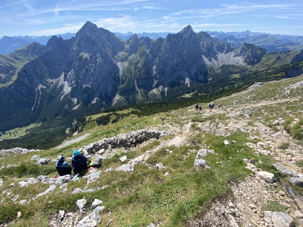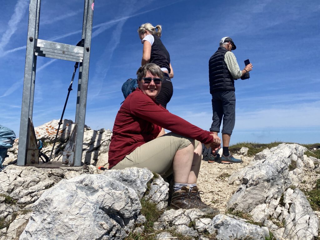 Der Aufstieg selbst ist ganz schön knackig, wir gehen rund 200 Hhm auf sehr engem und gerölligem Weg nach oben, was einige Konzentration erfordert. Natürlich ist die Große Schlicke aufgrund des Wetters und der Erreichbarkeit per Seilbahn auch recht frequentiert. Schließlich sind wir oben und werden nicht enttäuscht, denn der Rundum-Blick ist atemberaubend und entlohnt für die Mühe!