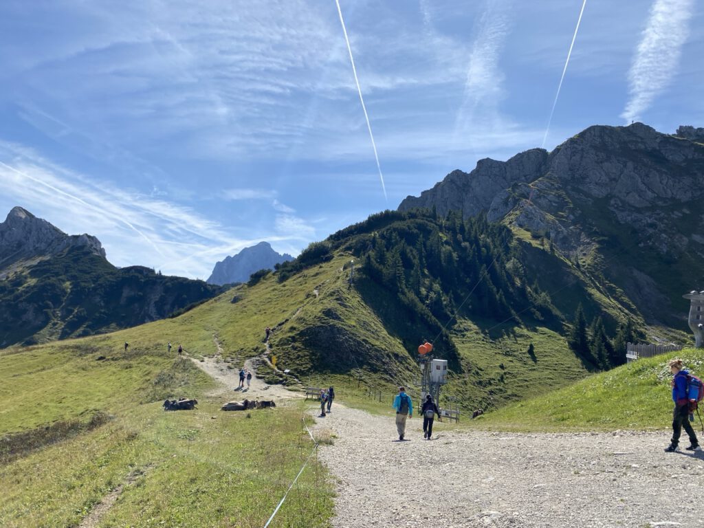 So nehmen wir die Bahn zum Füssener Jöchle, auf den Sattel, der schon für einige unserer Touren der Ausgangspunkt war. Heute sind wir nur als harter Kern zu dritt unterwegs, der Stempel-Hunter macht Pause – schließlich gibt es keinen Stempel zu ergattern, da auf dem Weg keine Alpe ist, in der man einen neuen Stempel bekommen könnte. Die beiden Jungs Philipp und Collin machen lieber einen Tag am Haldensee, bei diesem Wetter sicherlich auch eine gute Idee.