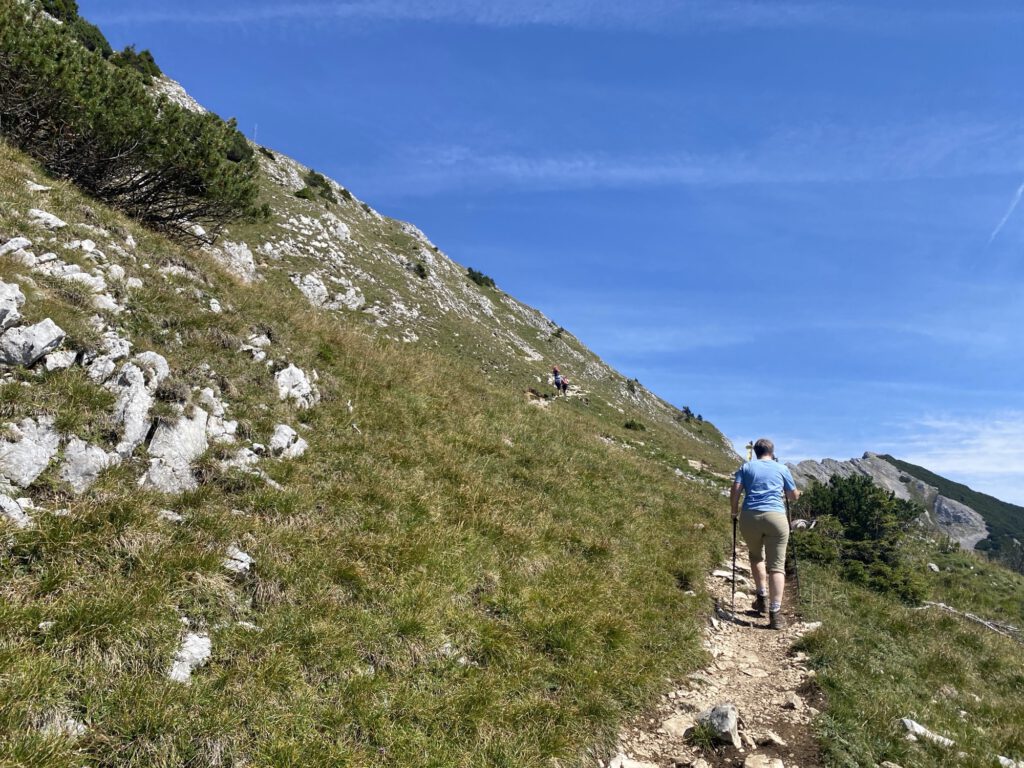 Der Weg schlängelt sich erst einmal durch Latschenkiefern-Büsche 45 min auf luftiger Höhe entlang des Kamms bis hin zum Fuß des letztlichen Aufstiegs in Richtung Gipfel.